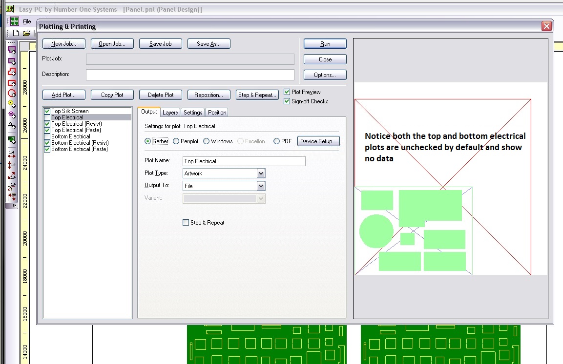 Some observations: - PCBs using the same Technology file plot as normal. - The silk screen routing and v-groove layers plot okay. - The solder mask layer only plots my fudicials - The solder paste layer plots the PCB names from the panel (PCB1, PCB2 etc.) - The Mechanical layer, which should only have the board outlines on it, also shows the pads.